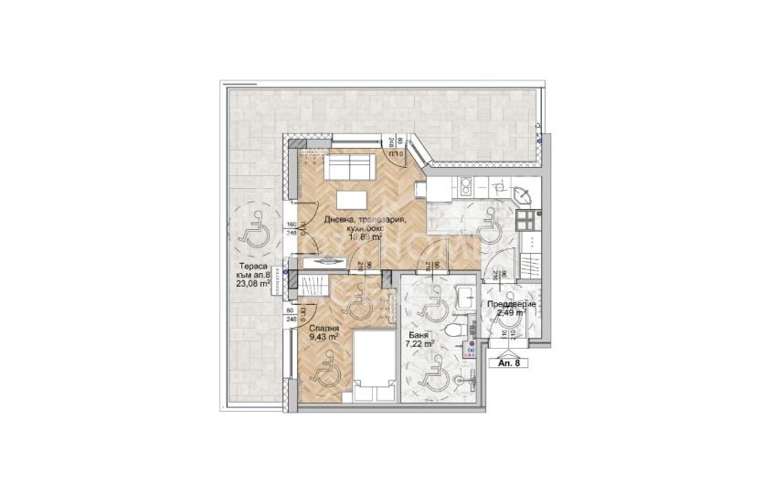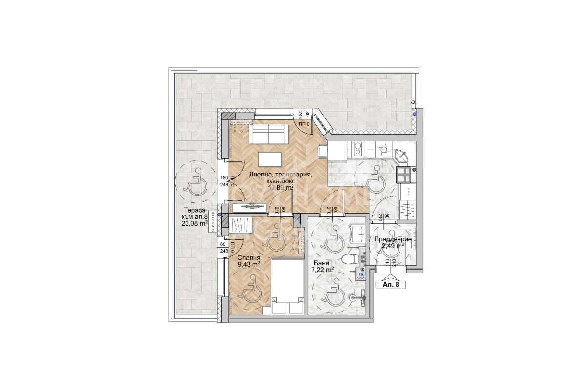 · Обща площ: 56.17 м2 и тераса 23.08 м2